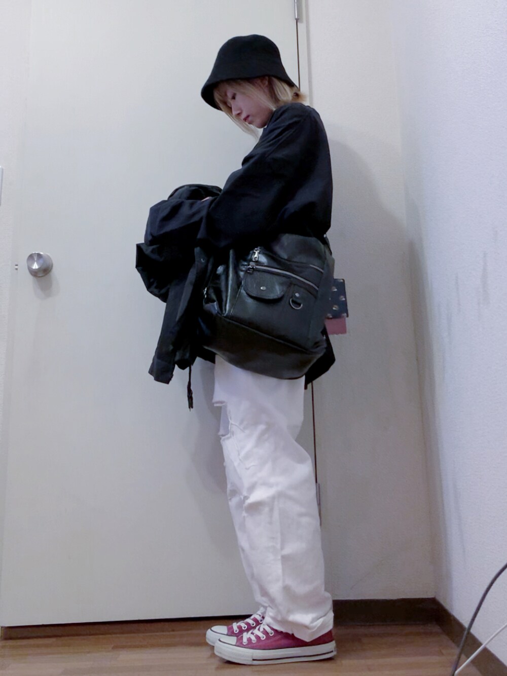 急に寒い( ´・д・)ネッ いつも下からアングルだから トップス短く見えるが 実際はゆるっと長い。 バッグ以外全て古着✰