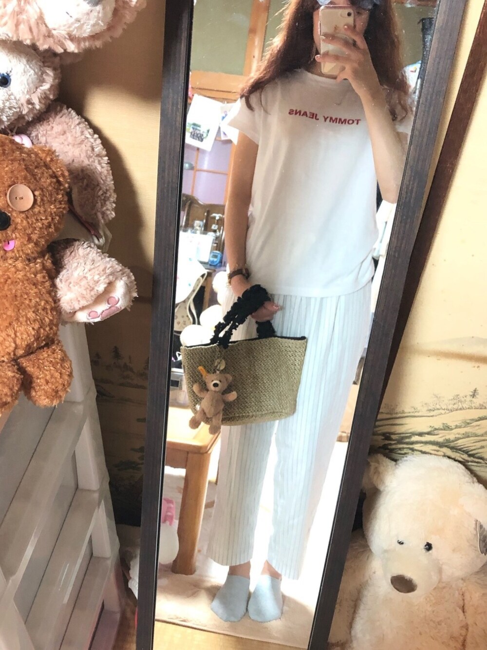 オールホワイトふぁっしょん TOMMYのロゴTむっちゃかわいくてお気に入り★ 白Tに赤文字ってのがほんまにかわええ。 部屋汚いのはスルーで。笑 カバンのくまさんもかわええポイント♡
