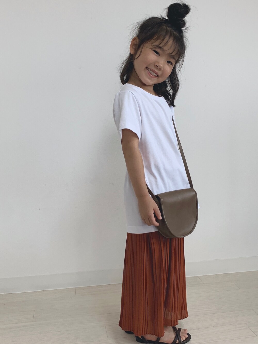 . テラコッタカラーのスカートを合わせてちょっぴり秋を先取り𓂅 . 小物はブラウンで🍫 . ゆるっとTがまた可愛いの♡ . やっぱりシンプルコーデが好きみたい❤︎ 完全にママの好みだけど。。笑