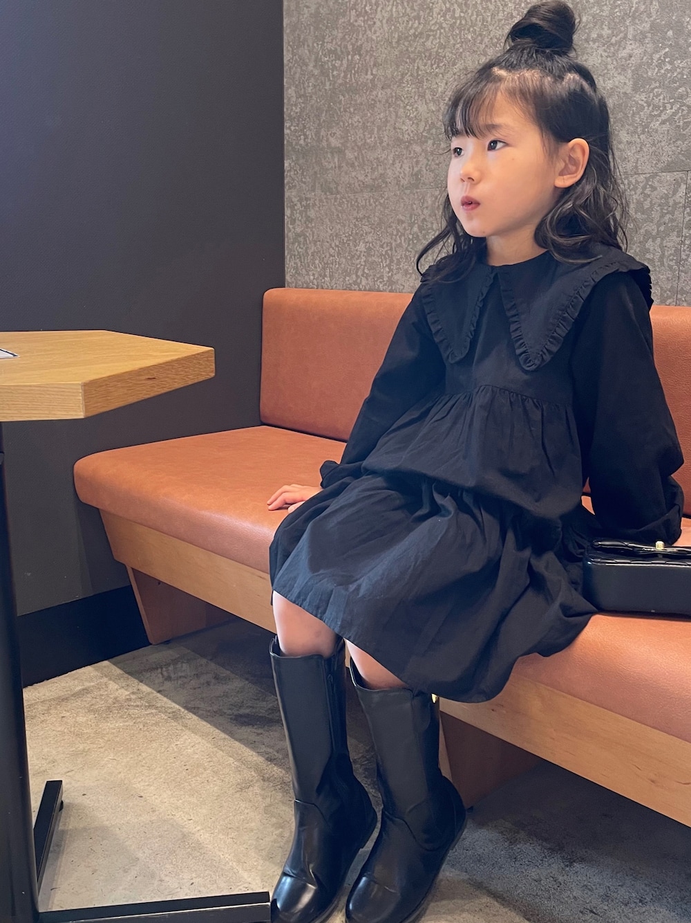 Black code ⋆ ꙳ . ビッグカラーワンピースにロングブーツで秋コーデ𓂅 . . (@grbirthday )で購入したワンピ♡ 襟の形も可愛いし高見えする☺︎‼︎ . . 子供のロングブーツってこんなお洒落なのね‼︎ デニムに合わせても可愛いし、色違いのキャメルやダークブラウンも欲しくなっちゃう。。♡