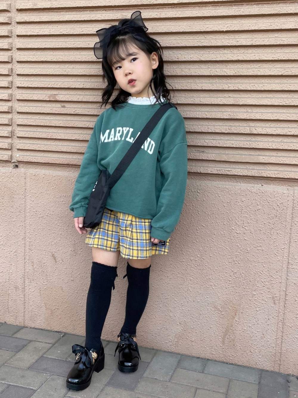 カレッジスウェット×チェックスカート . スクールガールコーデ⸝⋆ . . リボンやフリルをプラスしてガーリーに❤︎ 小物はブラックでまとめたよ𓂃 . . 普段はママの好みでモノトーンや淡色系が多いから新鮮‼︎ .