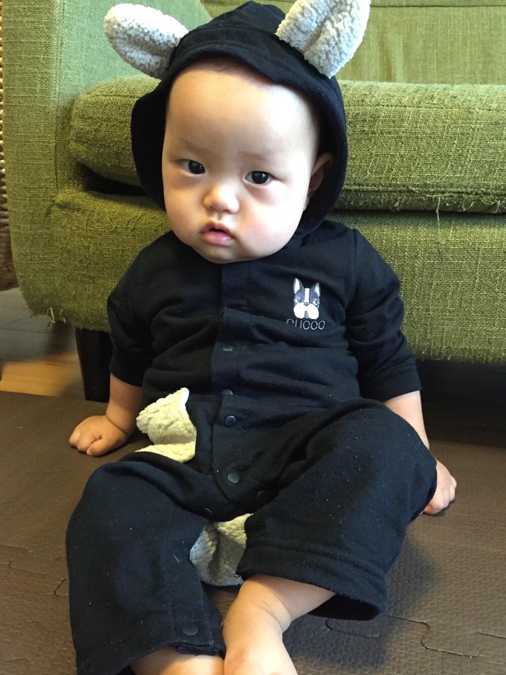 うちの子のボストンテリアにそっくりなロンパース。 思わずゲット! 後ろ姿もかわいいです❣️