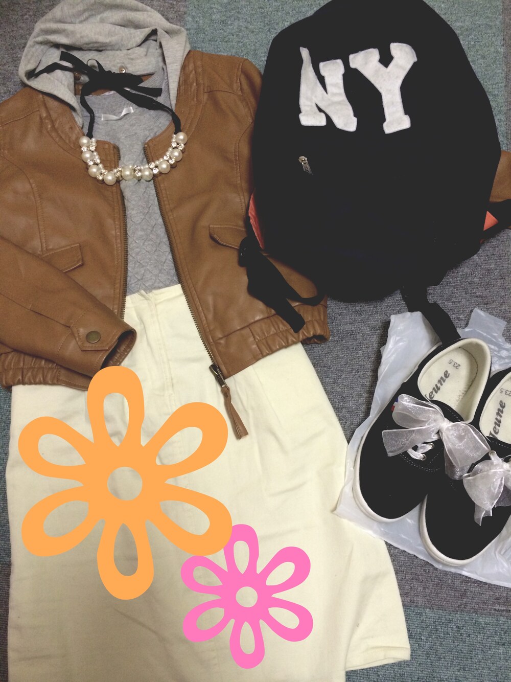 ブラウン 皮ジャン グレー 春ニット ホワイト タイトスカート リメイクスニーカー NY リュック