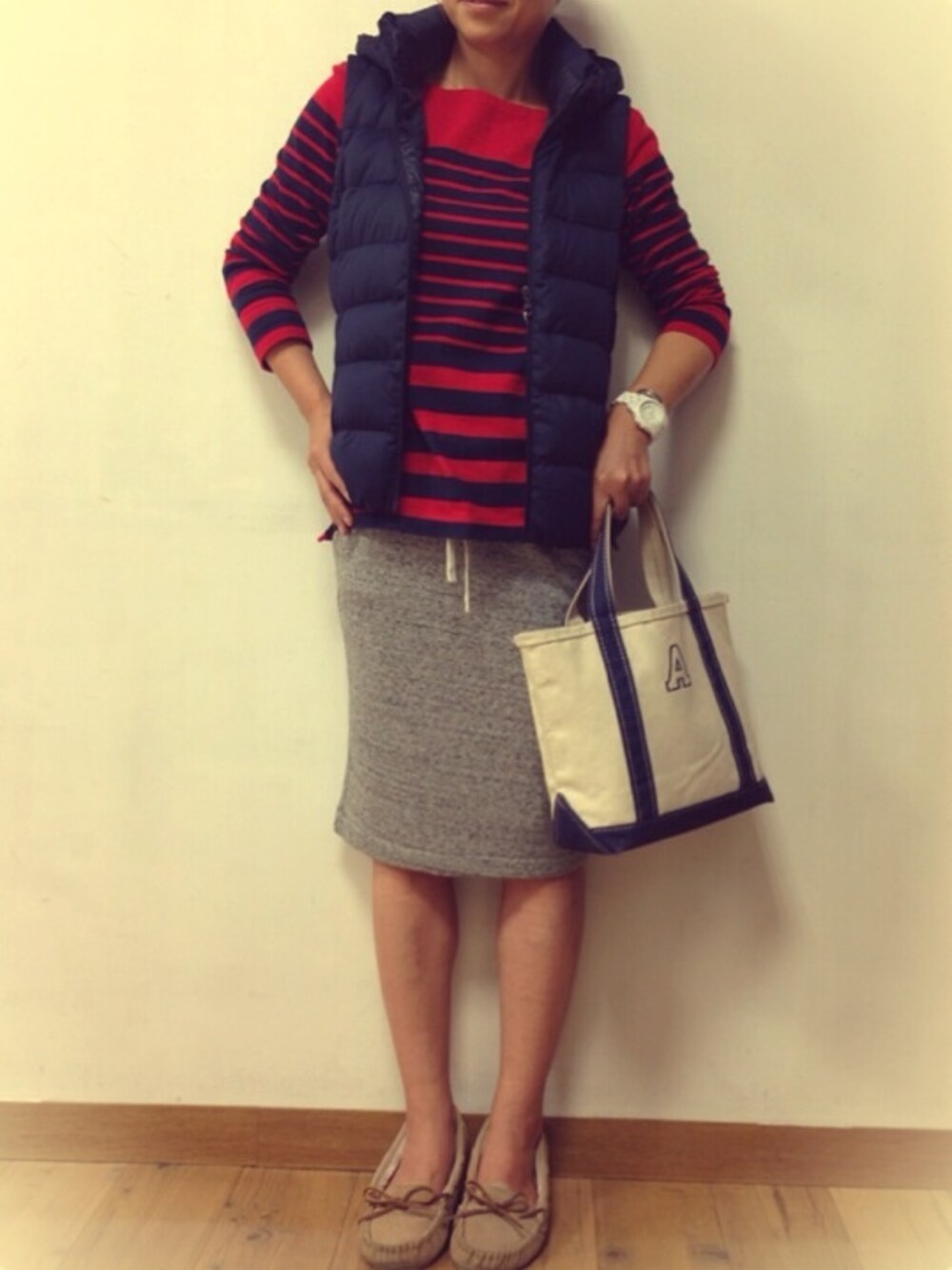 *スウェットボアスカート UNIQLO *ストレッチダウンベスト UNIQLO *バック L.L bean *時計 Marc Jacobs
