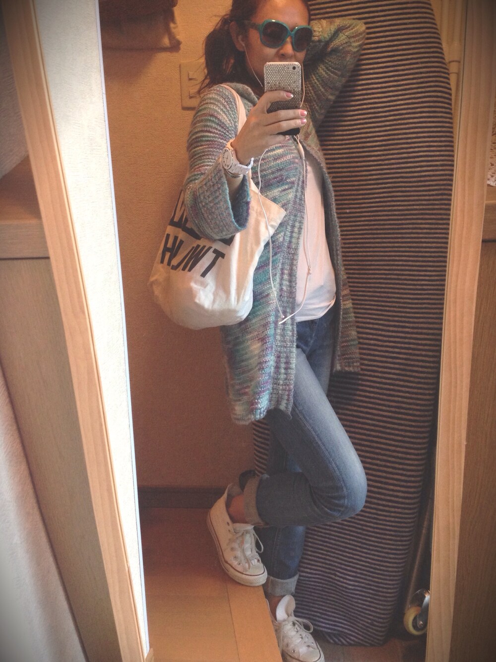 モンスターズインク⁈ ってお友達につっこまれるニットカーデ。笑 ECOバックはNYで毎日お世話になった Treder Joe's‼︎を愛用中。 ご近所買い物スタイル。