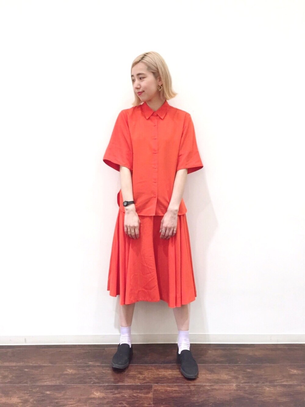 オレンジ系のシャツ/ブラウス、オレンジ系のスカートを着用したレディースの春コーディネートの1枚目の写真