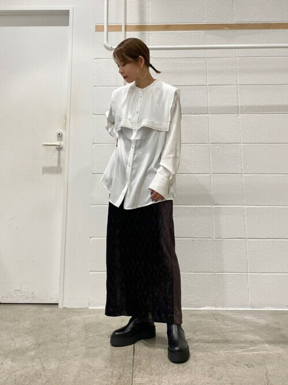 ベロアとスカートと大きな襟が特徴的なブラウスで ヴィンテージ感のあるコーデに◯ 甘くならないようにブーツはごつめを合わせました!