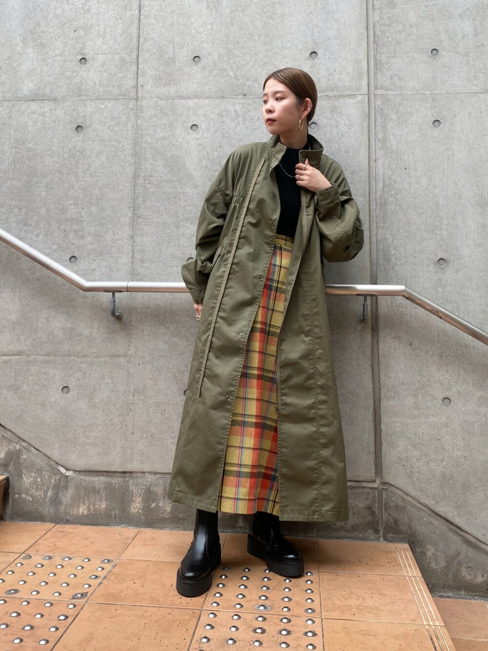 秋のおすすめコート🧥 バックのギャザーがカジュアルすぎず モードな雰囲気でも着られるのが◯ アウターから覗くチェックのスカートもかわいいです♡