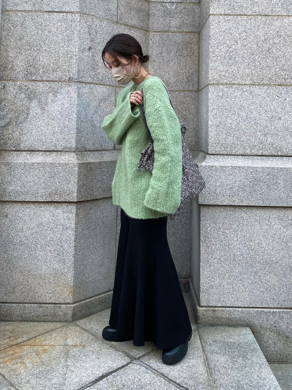 グリーン系のニット/セーターを着用したレディースの冬コーディネートの1枚目の写真