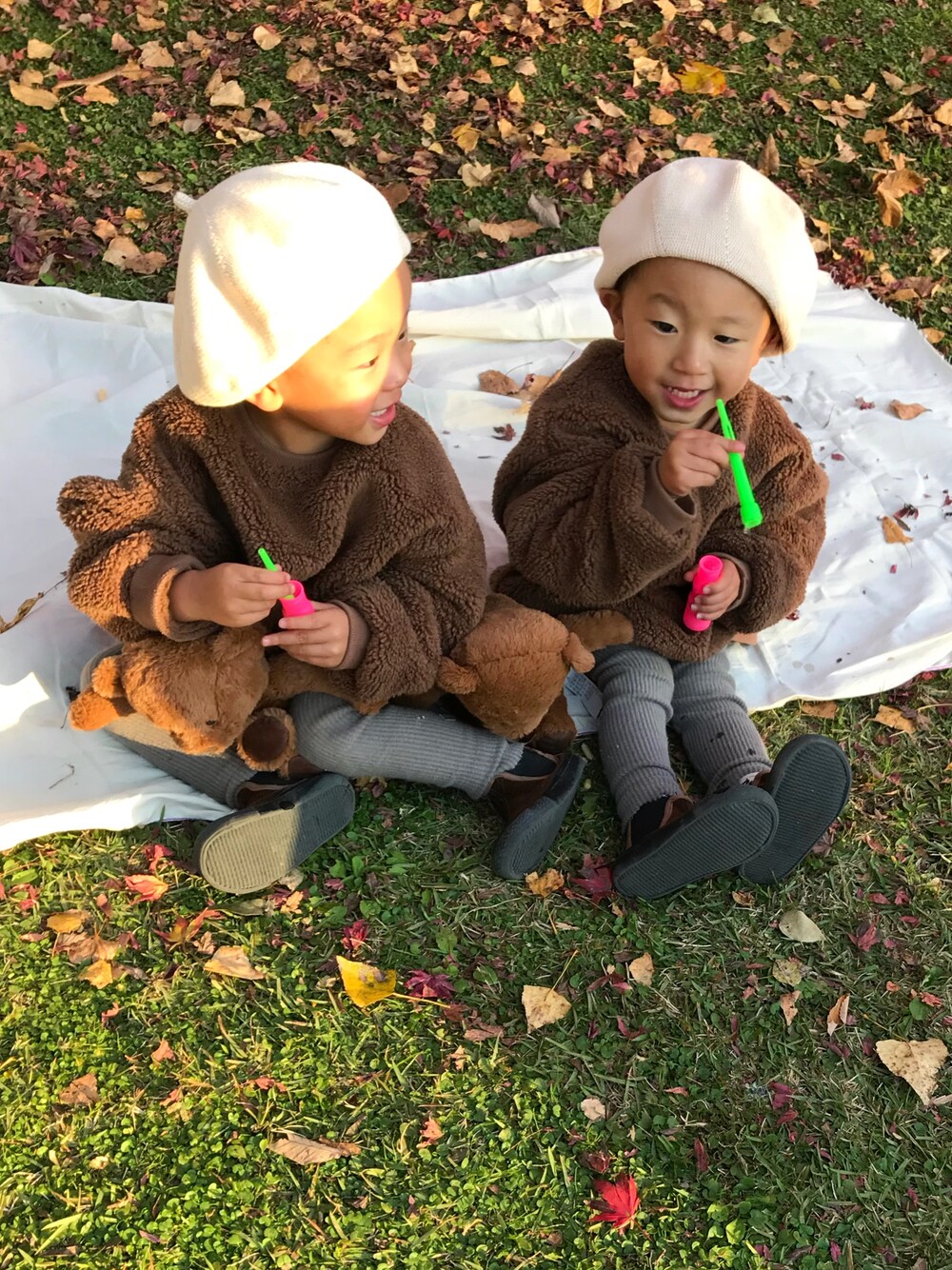 ブラウン系のブーツを着用したキッズの秋コーディネートの1枚目の写真