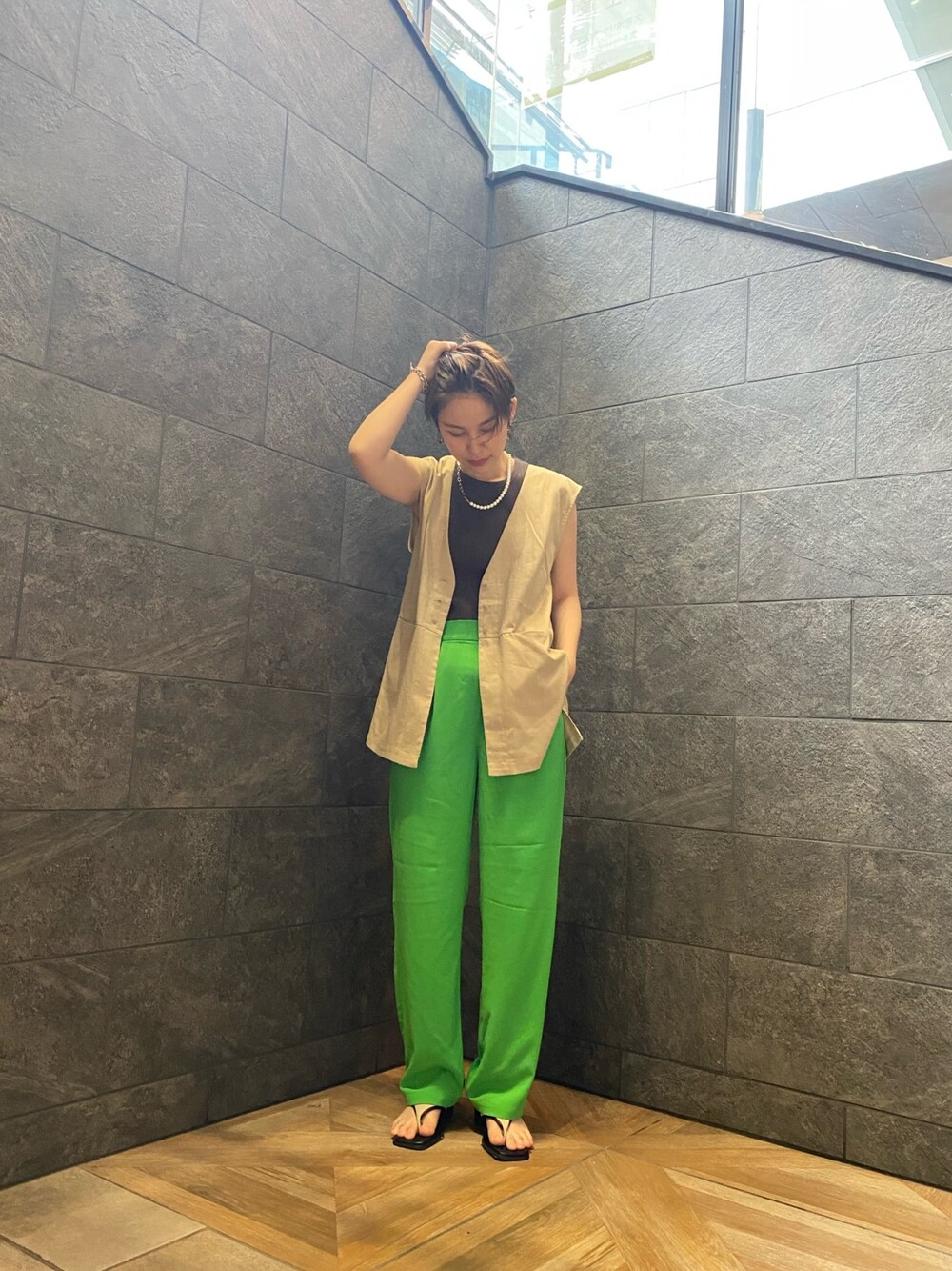 リネンのジレを大人っぽく、差し色にWEB限定のシーンのパンツで合わせた大人カジュアルコーデ。 *リネンジレ 夏でも着れるリネン素材のジレ。普段のコーデにプラスするだけでもオシャレ度が上がるアイテムだと思います。丈もお尻が隠れるくらいでサラッと羽織れて、暑い時期はタンクトップで合わせるのも可愛いと思います。 *パット付きアメスリタンクトップ 今季トレンドのアメスリタンク。カップ付きなのでいろんなトップスのインナーに使えて◎私も2色買いしようと思ってるアイテムです。 *【SCENE/シーン】ジョーゼットイージーパンツ/WEB限定 ウエストゴムでとても履きやすいパンツですが、綺麗めのスタイリングにも合うパンツ。落ち感のあるスッキリシルエットです。カラー展開もベーシックに使えるカラーから目を惹くカラーもありぜひおすすめです。