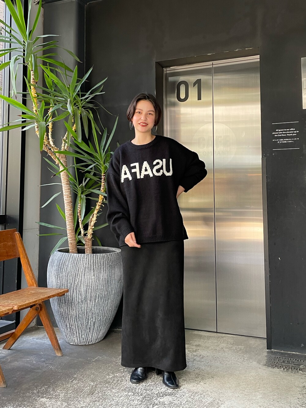 オールブラックコーデ。 *ビッグシルエットリバースロゴプルオーバーニット 身幅が広めで大きめのニット。胸元のロゴが特徴的で着心地や肌触りも◎なニットです。カジュアルなアイテムなのでスカートやワンピースをレイヤードさせて着るのがオススメです! *フェイクスウェードキャミワンピース シンプルなキャミワンピース。後ろのリボンも可愛いポイントです。キャミワンピースなので色んなレイヤードスタイルが楽しめます。アジャスター付きで長さ調整もできます。