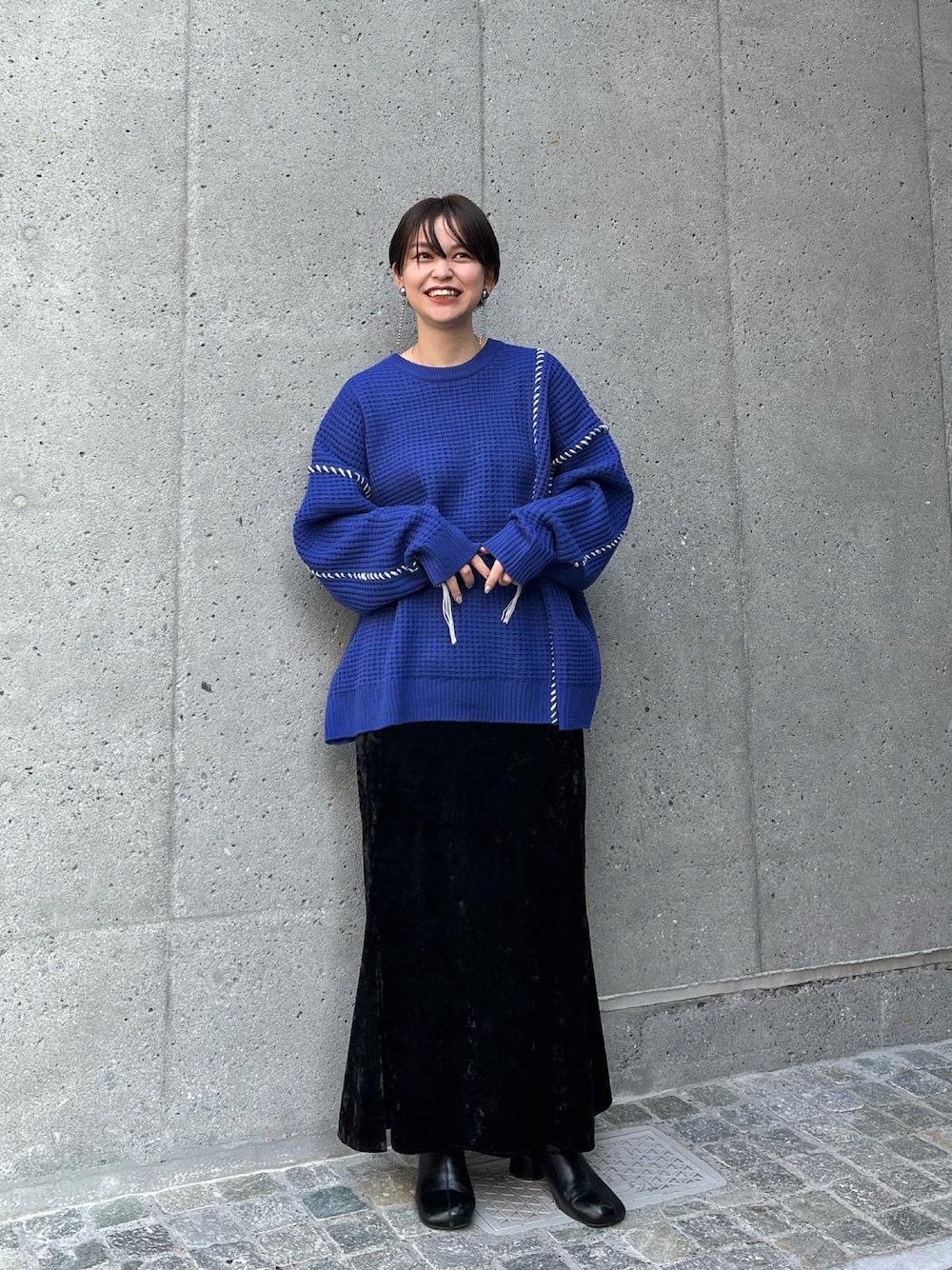 メンズのハンドステッチのニットはゆるっとレディースが着ても可愛いすぎます! *【2023SSアイテム】ハンドステッチワッフルニットプルオーバー フリーサイズです。チクチクせず着れてユルっとしたシルエット◎左右非対称なステッチの感じも新鮮で、袖のところにチョロっと紐が見えるのも可愛いポイントです。 *ベロアスリットマーメイドスカート サイドに深めのスリットが入った女性らしいスカート。程よく体のラインをひろいますがスリット入りなので歩きやすくベロア素材が大人っぽさを演出してくれる1着です。