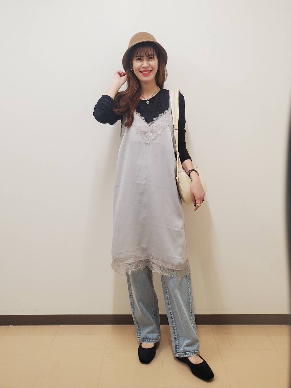 サテンキャミワンピースの大人カジュアルコーデ☺︎ トップス👉フリーサイズ ラメが今年らしいインナーです。 キャミソールとレイヤードするとぐっとコーディネートがおしゃれさ増します◎ ボトムス👉Mサイズ着用 クラッシュデザインがおしゃれなストレートデニム♪ 脚長効果もございます!