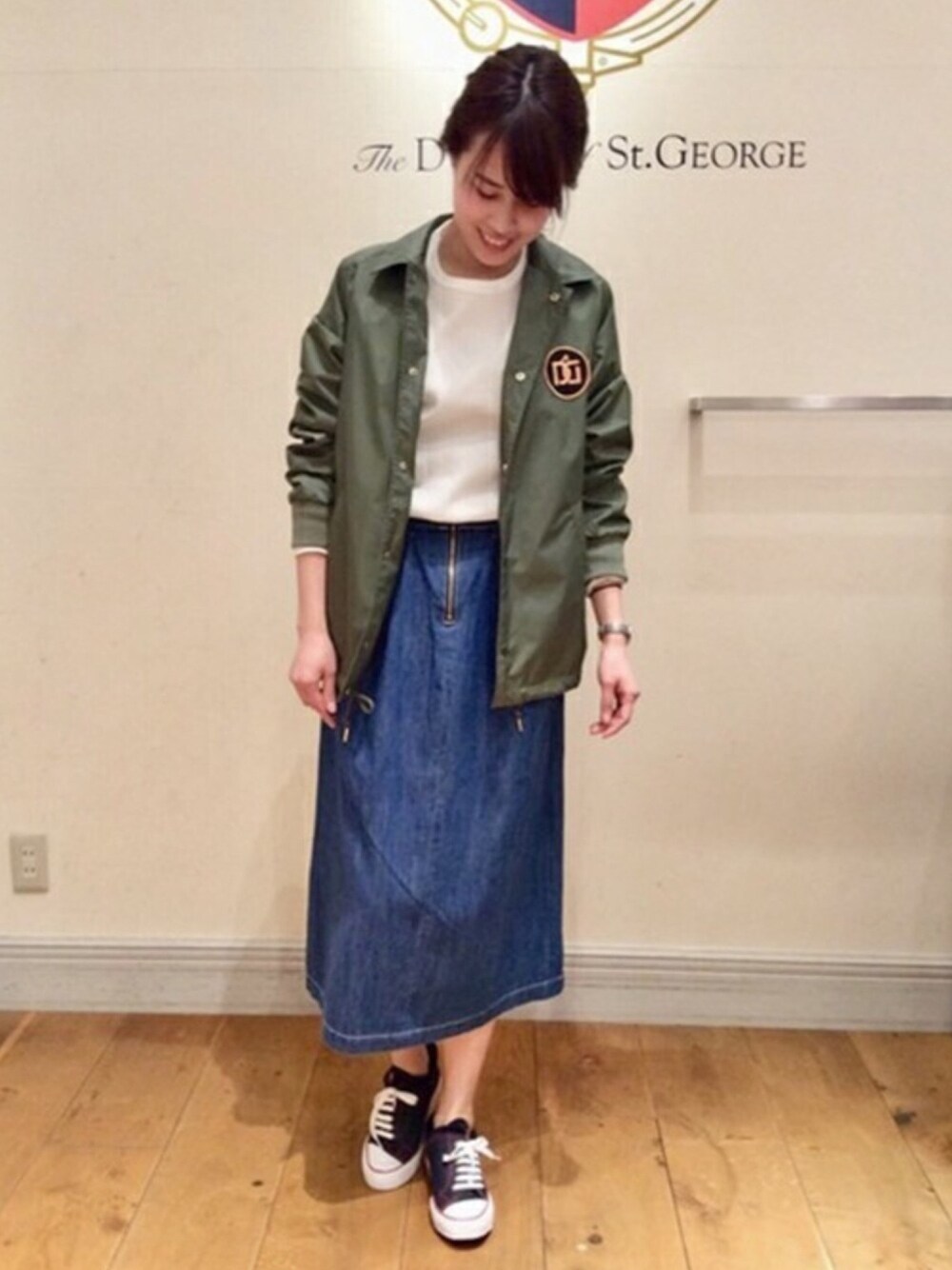 メンズのコーチジャケットに シルエットの綺麗なデニムスカートを合わせてみました。 トップスはゆるく。 ボトムスはタイトに。