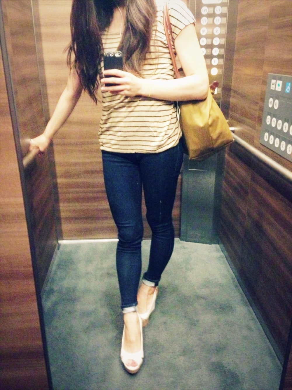 Tシャツ:moussy デニム:EMODA バック:longchamp 新しい白のウェッジサンダル! いつも通りちょーシンプルコーデ 暑いからスカートにすればよかったなあ。