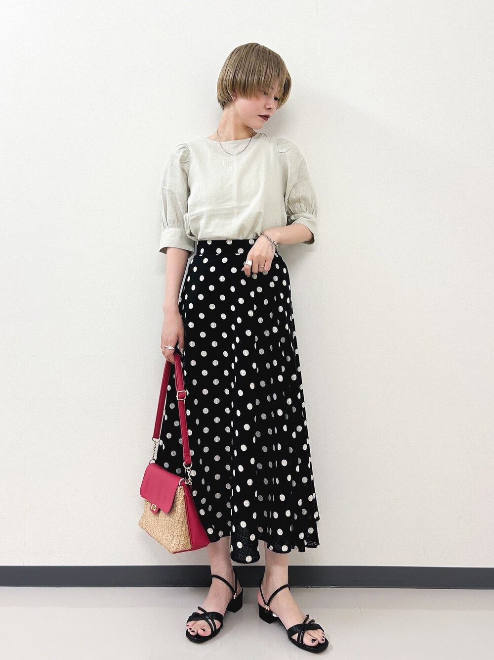 初夏のフェミニンコーデです! 甘くなりがちなドット柄はブラウスと合わせることで大人っぽくまとまります。 ○ブラウス ヨーロピアンリネンのパフ袖ブラウスです! ほどよい落ち感でリネンながらも上品に着やすいです。 ベージュの色味が青みのあるベージュでイエベブルベ問わず着ていただけそうに思いました! ○スカート 広がりすぎないシルエットの綺麗なスカートです! サイドに ファスナーが付いていて着脱も簡単です。 素材感が軽く、春〜夏にかけてさわやかに履きやすいです!