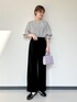 初夏までいけるモノトーンコーデです! ボーダー×スラックスは王道で使いやすいです。 ○ブラウス ふんわりボリューム感がかわいい1枚! お袖のゴムできゅっと止まりボリュームがでてくれます。 後ろにもタックがあるので窮屈感なくさらりと着やすいアイテムです。 ○パンツ 個人的イチオシパンツです! ハイウエストにタック入りで脚長効果が抜群です。 シャリ感のある素材で春〜秋にかけて履きやすい素材感です。