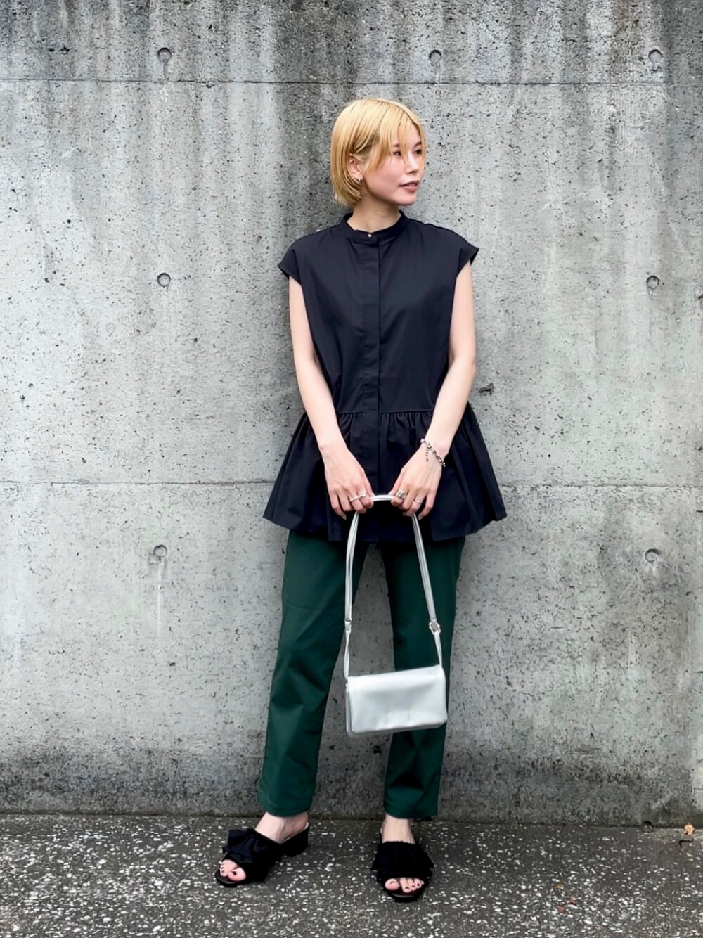▼サイズ感 ーーーーー 👚Sサイズ未入荷の為Mサイズ着用してます。 脇の開き方は広めですし、ペプラムでふわっとしたシルエットですのでゆったり着用できます! 👖少し太めなテーパードパンツ。 ウエストゴムと生地の伸縮性で窮屈感ないです! ▼素材感・着心地 ーーーーーーーー 👚ハリのある上品なブラウス! ゆとりのあるシルエットのおかげで通気性もあり着心地良いです。 👖ひんやり感じる接触冷感機能付き! 伸びが良く、リラックスして着用できます。 ▼おすすめポイント ーーーーーーーーー 👚大人綺麗なブラウス! おしりがすっぽり隠れる着丈でパンツスタイルにおすすめです。 👖大人気のサマーハイパーテーパードパンツのnewバージョンです! ダークグリーンは大人かっこよく着るのにおすすめ♡ ▼スタイリングポイント ーーーーーーーーーーー ブラックとダークグリーンで深めカラーの組み合わせです。 ダークカラーを着るとお肌とコントラストができるのでお肌が白く見えやすいです!