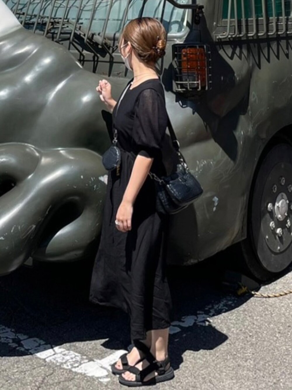 ブラック系のワンピース/ドレス、ブラック系のトップス、ブラック系のショルダーバッグを着用したレディースの秋コーディネートの1枚目の写真
