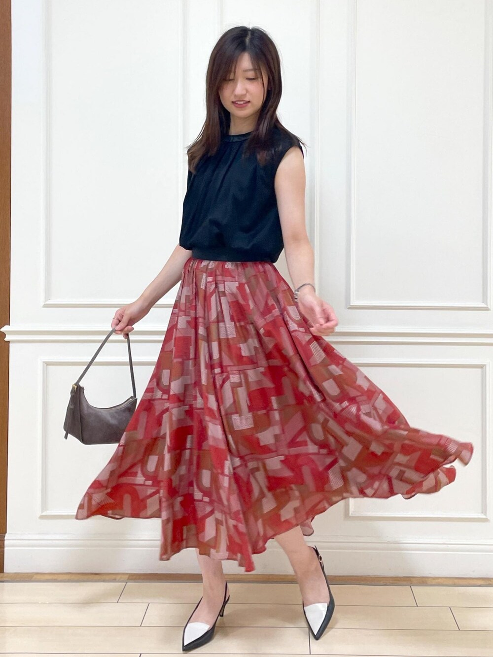 スカートがボリュームあるので トップスはコンパクトめにシャツインしましました。 晩夏にオススメな色使いです♪ スカートはセットアップ対応品です。