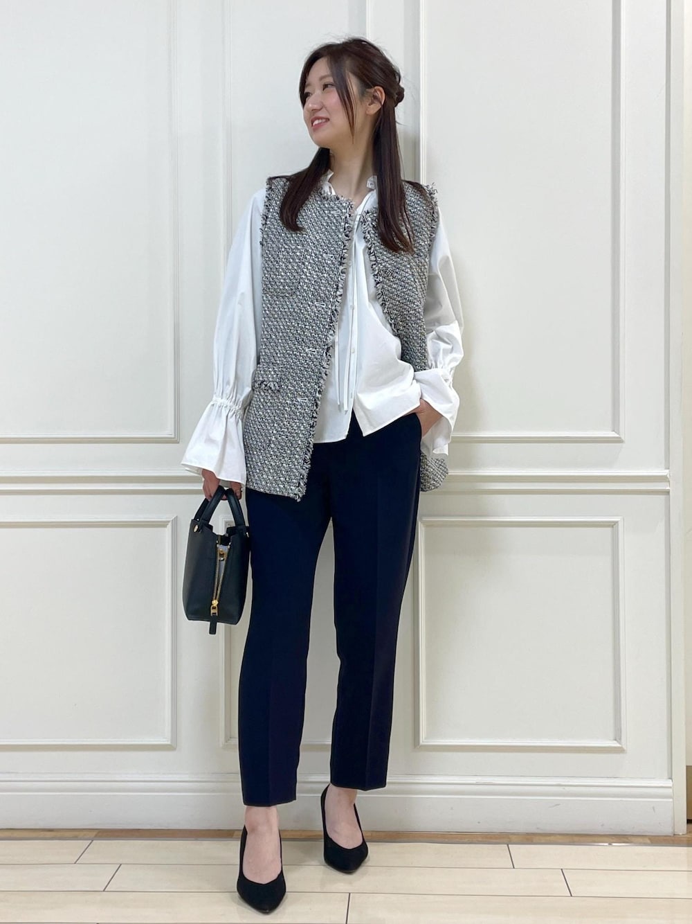 入卒式などの行事ごとに使えるコーディネート。 長めのジレなので安心感のある丈感。 パンツは同素材で ジャケット、ブラウス、スカートもありますので セットでの着用も素敵です◎