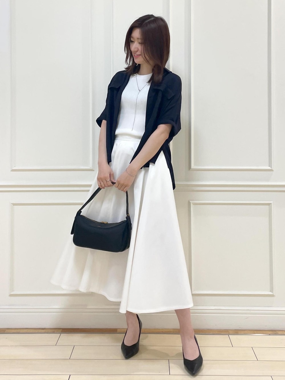 セットアップ対応のシャツを 別のボトムと合わせてみました。 ゆったりとしたサイズ感なので 綺麗目に着るために いつもよりひとつ下のサイズを着用しています。 インナーとボトムのカラーを揃えて すっきりシンプルにしました。