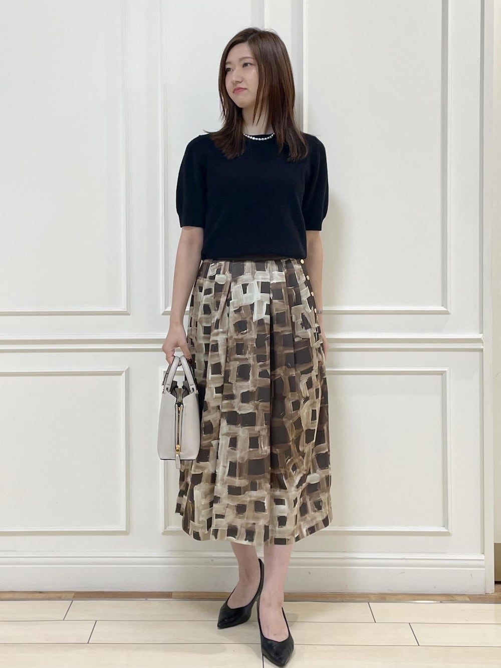 過ごしやすい気候にオススメなコーディネート。 着心地の良いカシミヤ混の五分袖ニット、 シンプルなので 柄物スカートとパールネックレスでアクセントに。 (一枚目はシャツインしています。) ※パンプスは私物です。