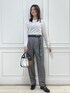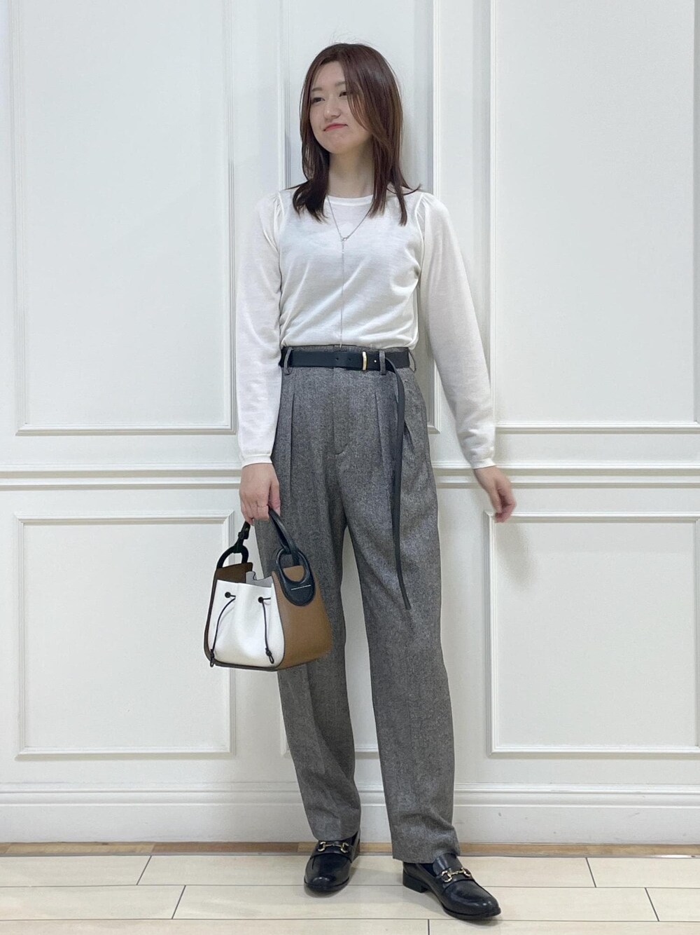 長袖、ヘリンボーン、 秋めいたコーディネートですが ニットは薄手なので合い物としても とても活躍していただけます◎