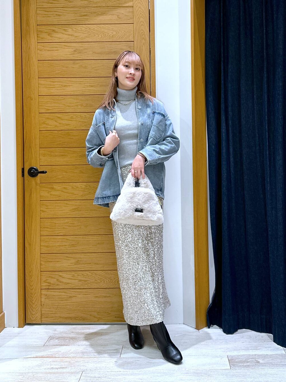 綺麗目カジュアルコーデ✨ ゆったり大きめのデニムジャケット😄 今回は綺麗目にタートルネックとラメのスカートと合わせました🩷 ラメスカートはストレッチも効いていて体型も拾いにくくなってます!! 高級感そして存在感あるスカートはコーデのワンポイントにもなります😄 是非チェックしてみてください! Instagram・スタッフボード・WEAR共にフォローお願いします♡