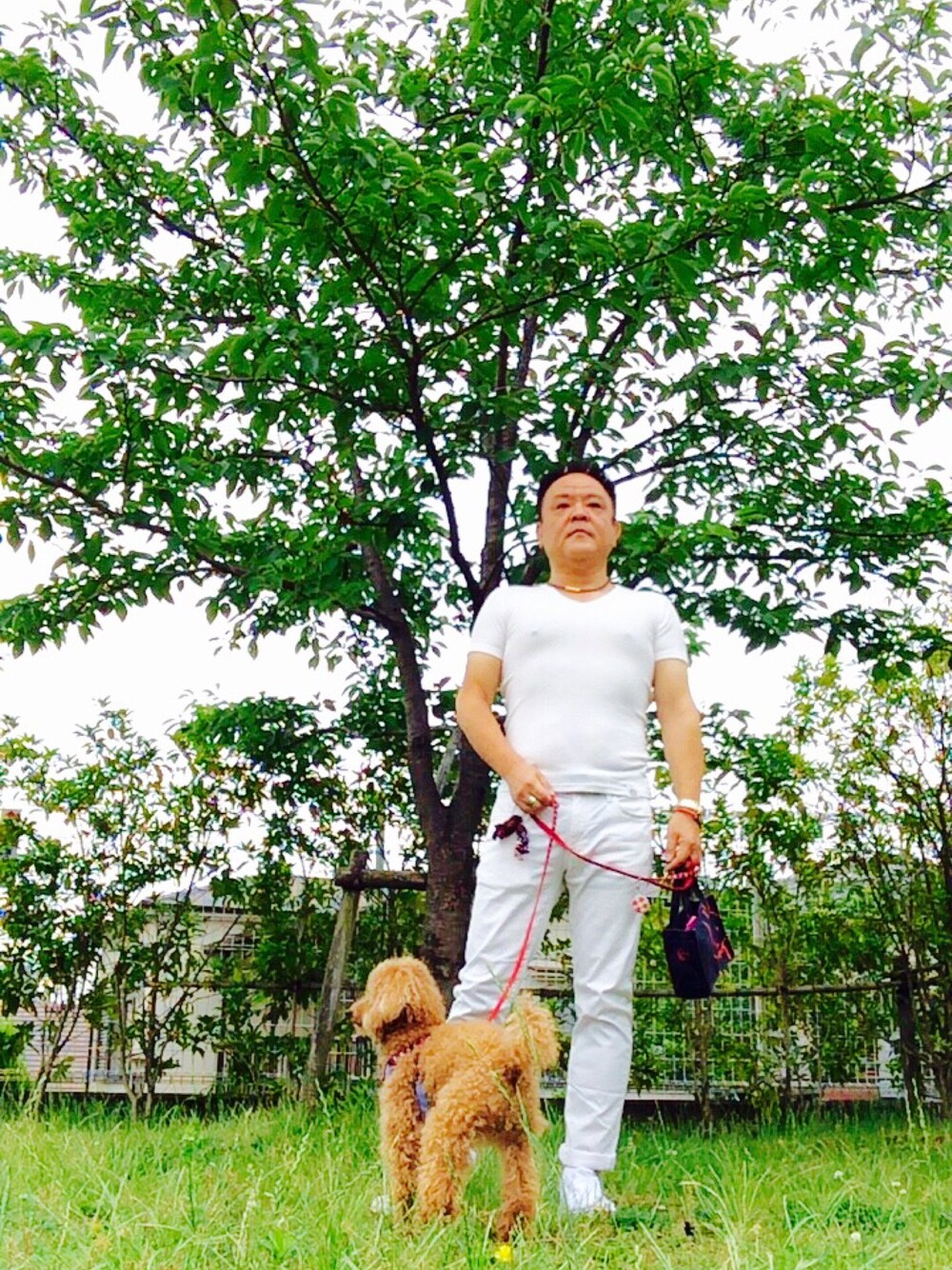 ホワイトコーデでグリーンと合わせました💖 親分を連れて(^_^)