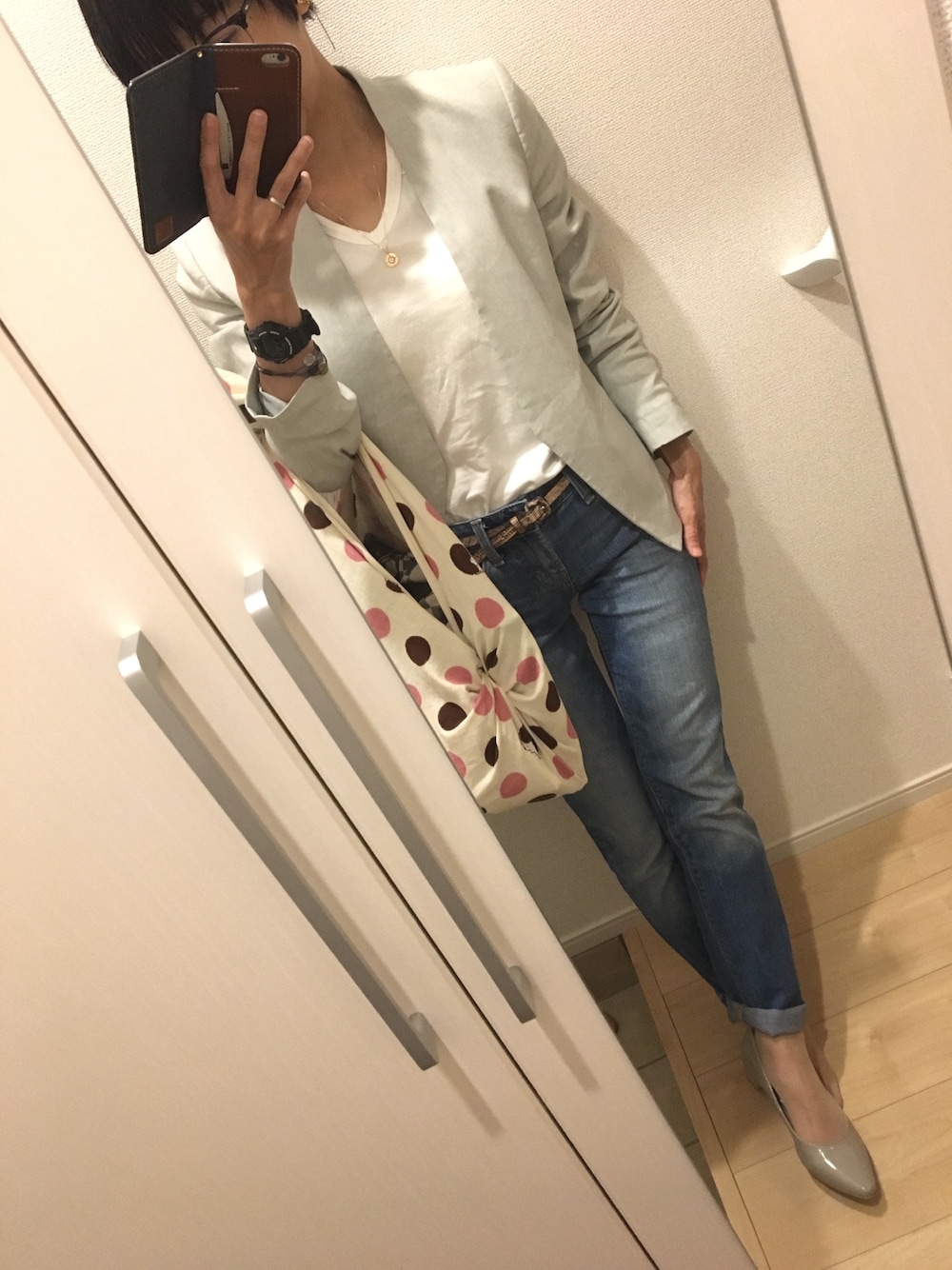 備忘録 関東は、時々大雨。寒い。 ポイント 白T×ジーンズをジャケット&パンプスで格上げ。雨だし、全体がシンプルだから、風呂敷で賑やかに。