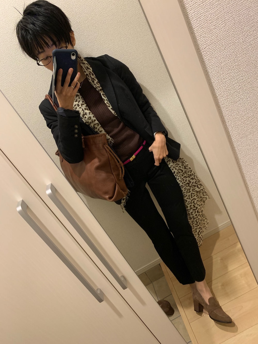 ベルトのピンクがポイントです。他は黒×ブラウンで。んー、ハイウエスト流行りの時期に、ミドルウエストにするのはチャレンジャーだったか?一応ハイヒールにしてみました。 ジャケットの下にユニクロのウルトラダウン?ライトダウン?を着ています。あったかい