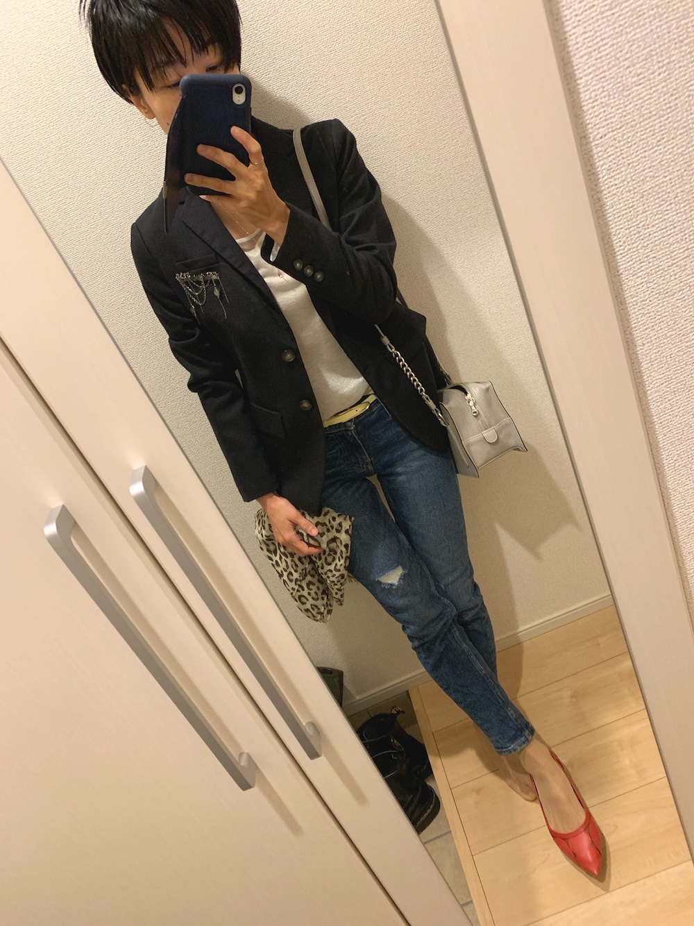 観てくださり有難うございます^_^ フレンチ気分?ブローチと赤いフラットパンプスがポイントですかね。 着回しまくりコーデなので、小物で遊ぶ笑