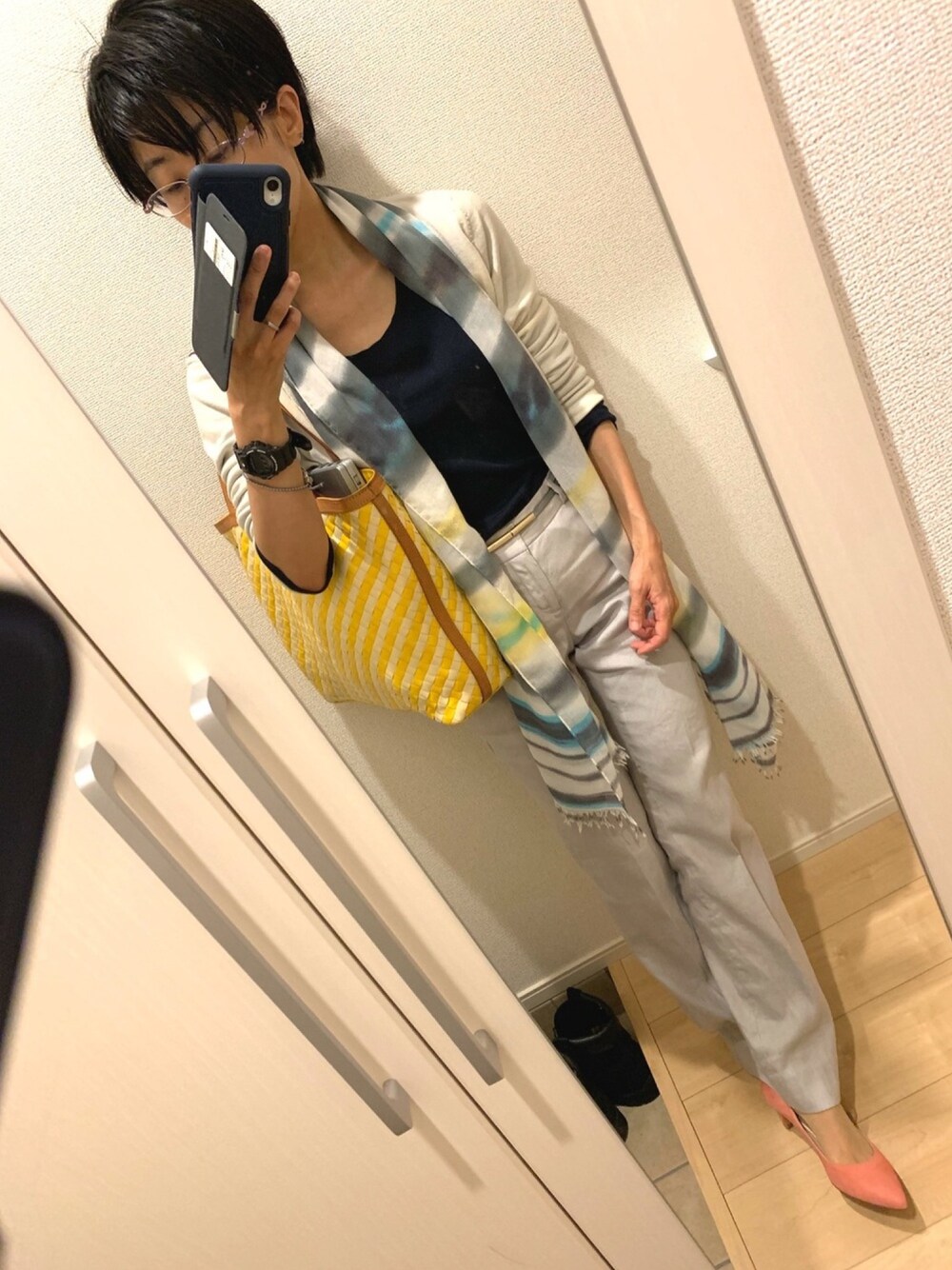 見て下さって有難うございます^_^ 初夏、ですね。リネン早いかと思いきや、もう着る時期! 寒がりだから、見た目暑そうだけど… カーデの袖からインナーを出したのと、バッグとストールのイエローリンクがポイントですかね。カラフルだけど、カラー達のトーンを三種類くらいに搾れば纏まってる…ような。パンプス可愛いです