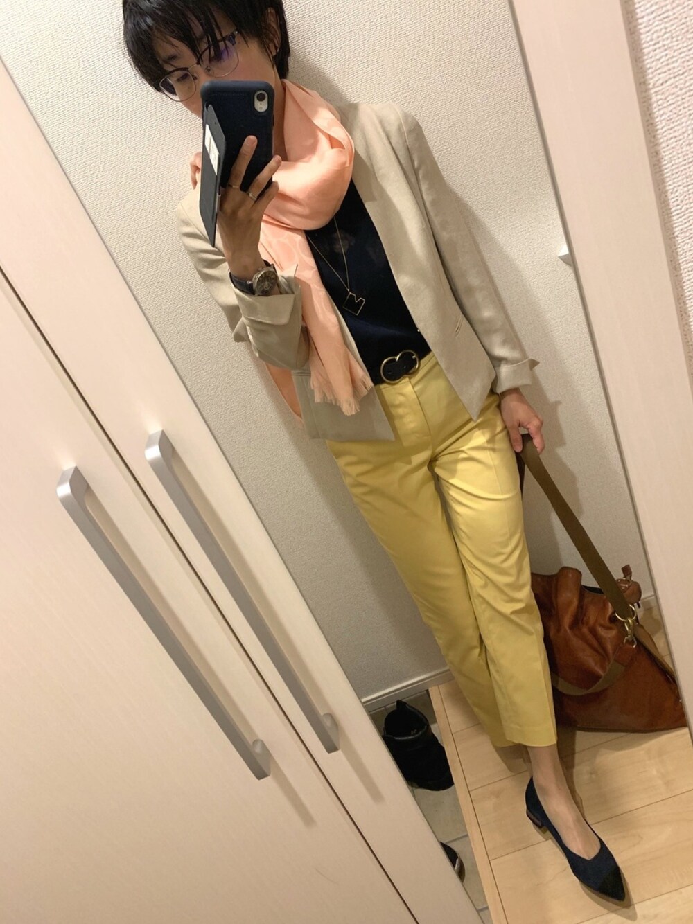 見て下さって有難うございます^_^ 今日の出張先は暑いようですが、早朝は、肌寒く、悩みますね…こういう日は。 ネイビー×イエローにジャケットと寒さとエアコン対策にストールを