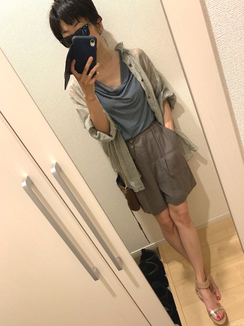 見てくださりありがとうございます😊 また夏日ですね。今日は、朝から本気で暑い… ノースリーブ×ショートパンツ。透け感のあるシャツを羽織って袖まくり。足元は、ヌーディに。このサンダル可愛いけどビニールが指に当たって痛いっすw