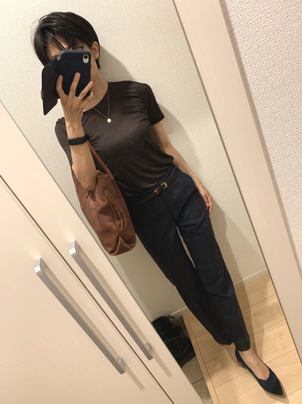 見てくださりありがとうございます😊 今日も蒸してますね。 ネイビー×ブラウンが好きです。ゴールドアクセサリーでTシャツを格上げ。