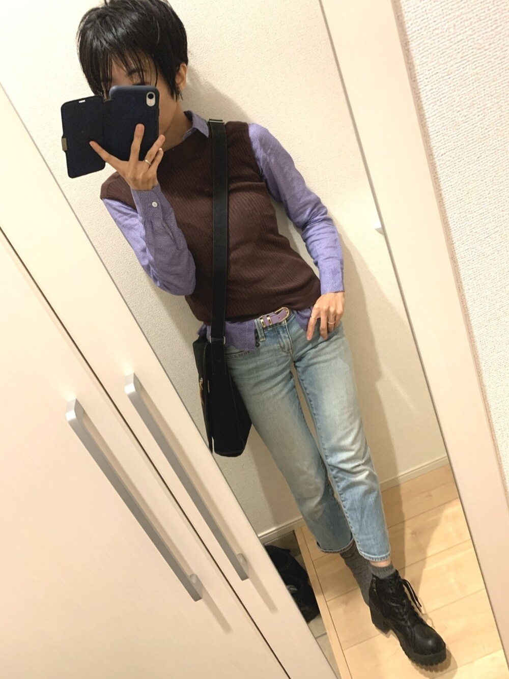 見てくださりありがとうございます😊 ブラウン×パープル×ブルー。ブラックをちょい挿し。読書の秋で、プレッピー風味? 雨だったからブーツです。 イヤリングは、高校生の頃(まだ、20世紀だった…)買ったもの。シャツと同じ色のビーズが付いています。我ながら物持良いな……京都は寺町に有ったお店…確か、予備校帰りに買った…制服だったから目立ってたかも…そんな制服は、あの頃ダサかった今年の流行色。懐かしい…