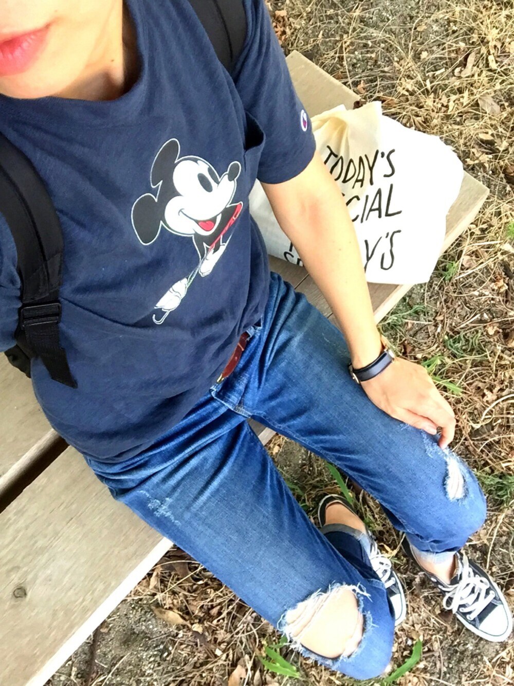 用事を終えて娘と公園👯あせたネイビーの色味がお気に入りのミッキー×champion👕
