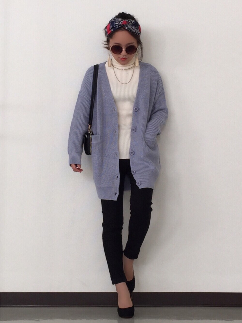 水色カーディガン×白インナー×柄スカーフで春意識コーディネート!