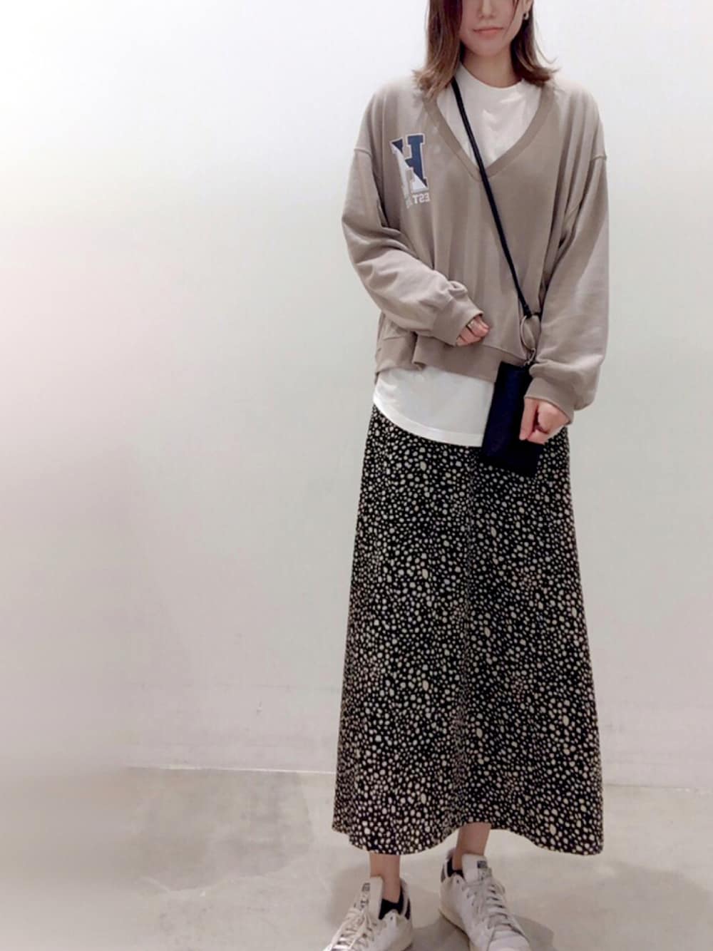 ホワイト系のスニーカーを着用したレディースの秋コーディネートの1枚目の写真