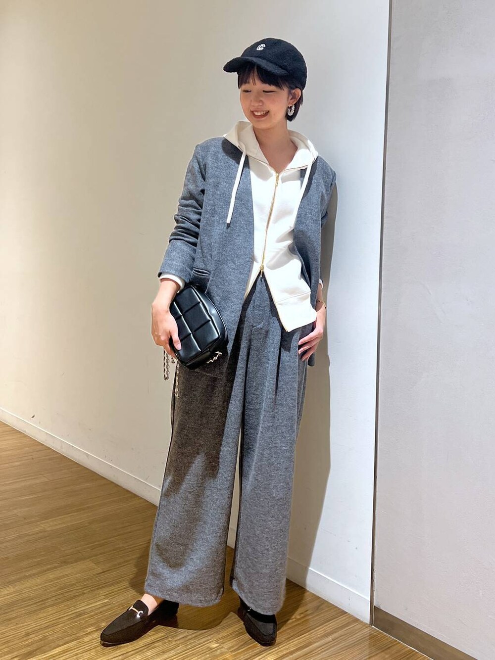 ジャケット×パーカー インナーとして使うパーカーは、コンパクトなサイズ感が◎ いつもと違ったイメージで、 コーディネートしてみました! パンツは丈長めで、 かなりワイドなシルエットです◎