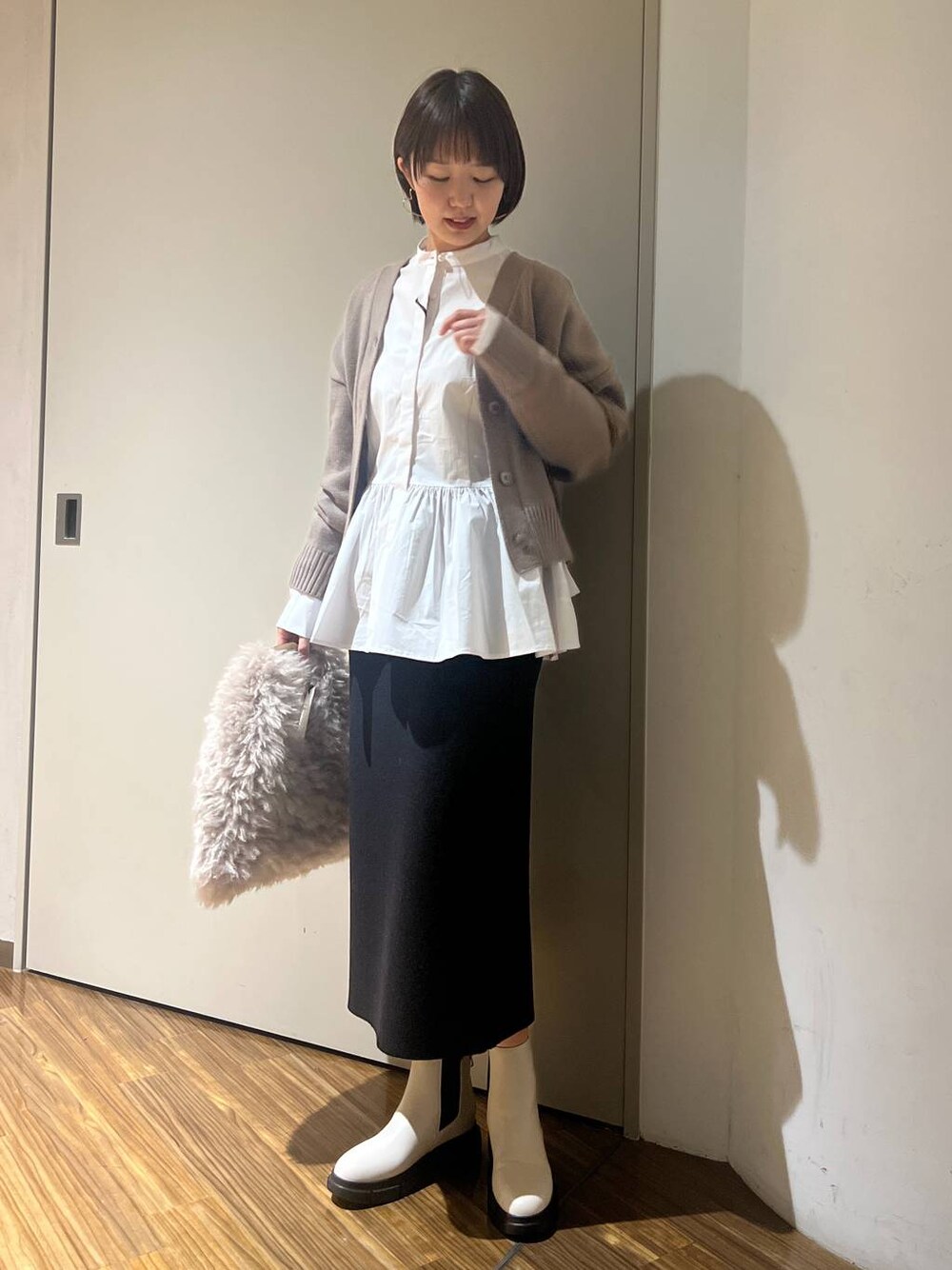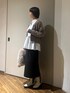 ブラウス×カーデの きちんとコーデ 短い丈のカーデは、長めのブラウスと合わせると、 バランスよく着ていただけます!
