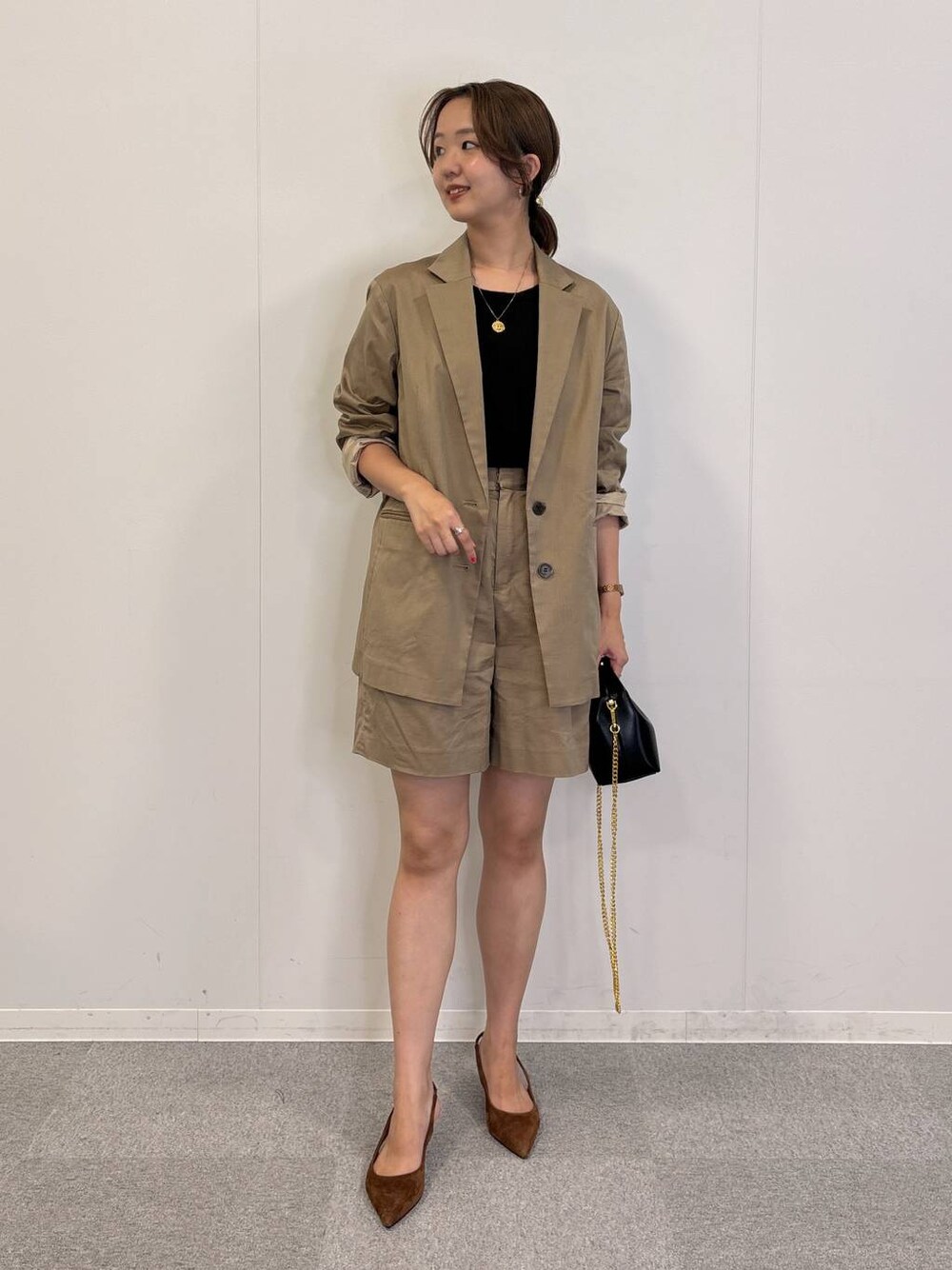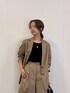 リアルバイコーデ ジャケット 肩パッドなしのカジュアルにも合わせやすいジャケット こちらのカラーは、見る方向によって少しカーキがかって見えます! ボタンがマーブルカラーなところがお気に入りです! パンツ ウエストやや細め ハイウエストでタックが入っているので、太もも、 お腹周り目立ちにくいです。 ショートパンツ初心者の方は、ロングブーツを合わせても◎