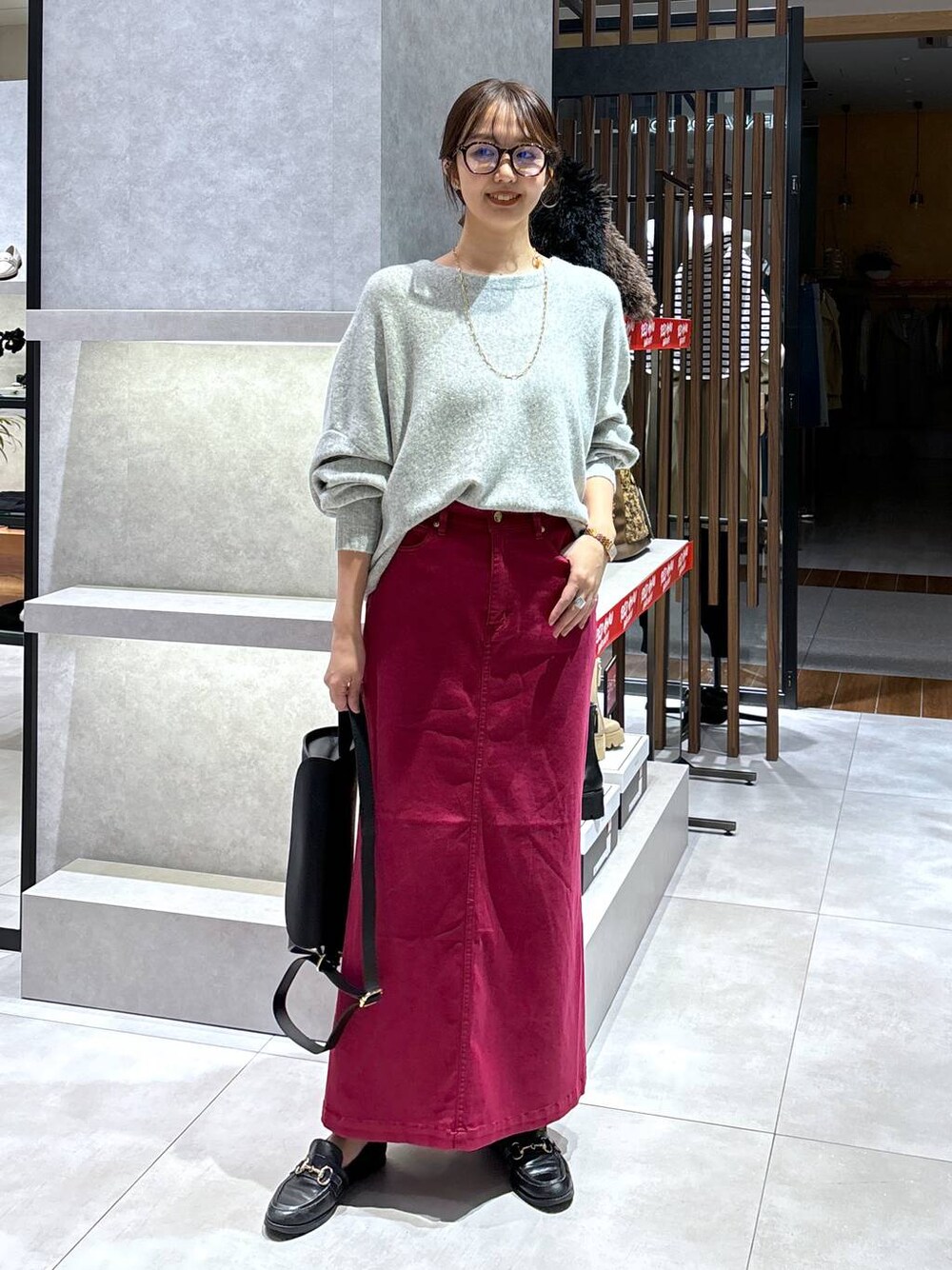 トップス セールになったニット! 柔らかい触り心地です。 ゆったりとした長めのシルエットが素敵です! スカート ピカデリーのスカート。 暗めの赤がコーディネートのアクセントになります!