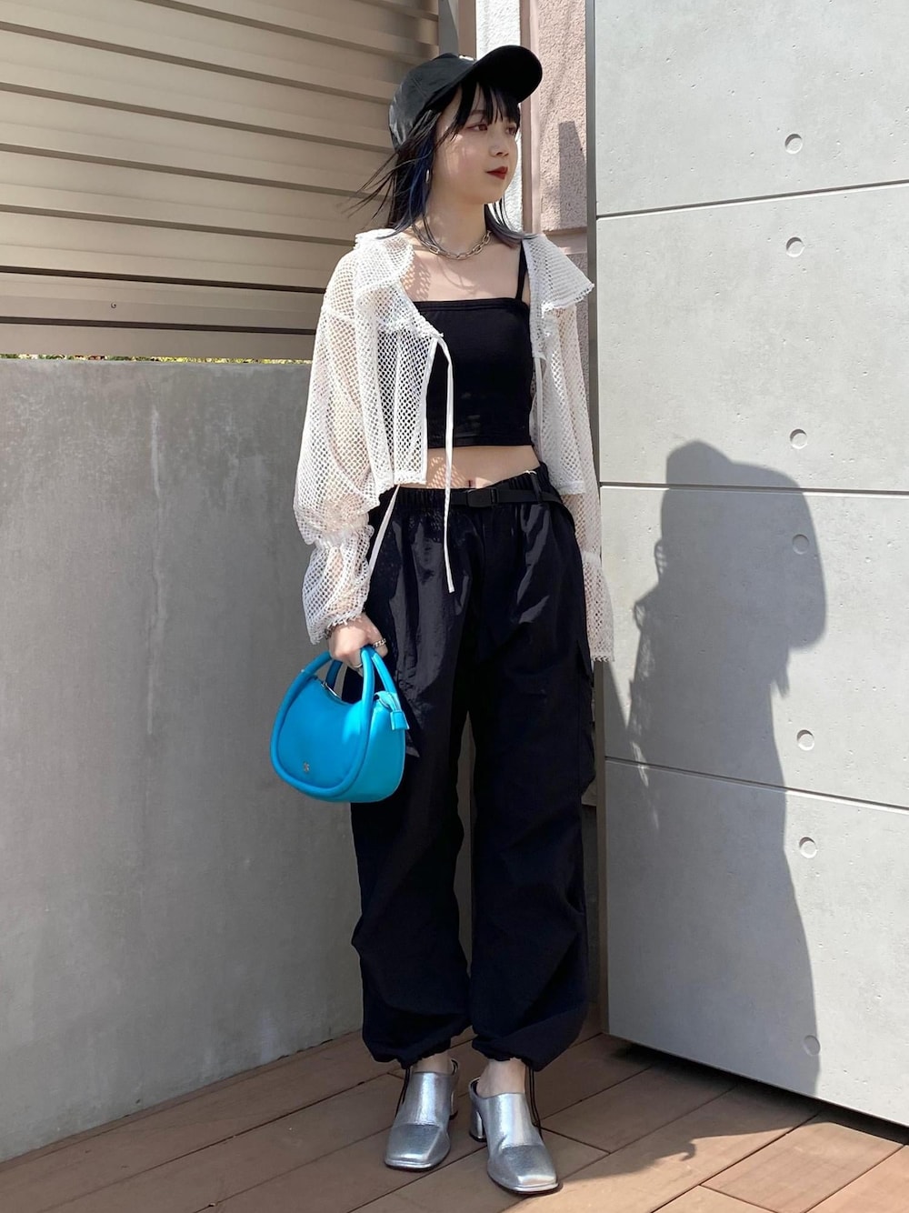 グラミチのカーゴパンツと短丈インナーにメッシュカーデを羽織ってスポーティーな雰囲気に♩ シンプルなカラーなので鮮やかな小物で遊びをプラス❤︎ 是非お試しください!!