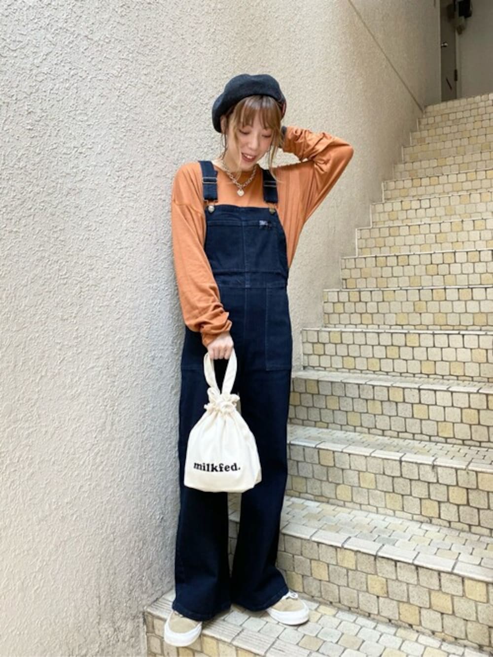 秋の新作が入荷したので秋っぽいコーディネートで オーバーオールのパンツの形はフレアになっているので、脚をスラッと見せてくれてとてもきれいな形になっています!ストレッチが効いているのでストレスフリーで着用して頂けます