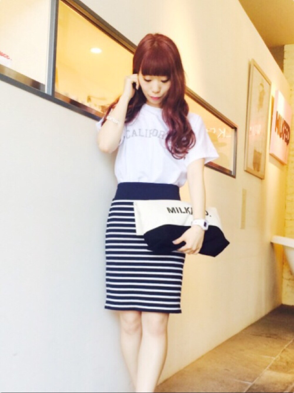 今日はオススメのコーディネートです Tシャツはシンプルですが、袖のところにロゴの刺繍が入っていたりこだわりが詰まっています☆ スカートもボーダーでカジュアルですがタイトスカートの形が大人っぽさを引き出してくれ、さらに素材が柔らかいのでとても着やすいですよー(^_^)