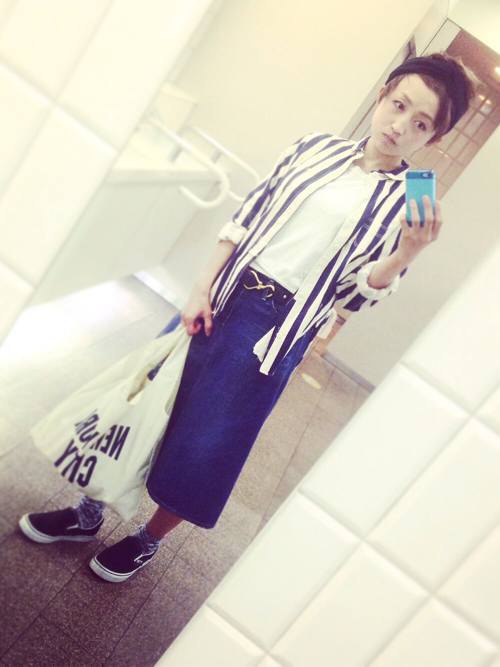 ショート丈トップスにビックシルエットのストライプシャツを羽織りました。 全体的にネイビー。 ネイビー好きなのでこれからの季節ほっとくとネイビーばっかきちゃうので気をつけます…w